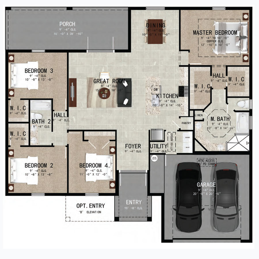 Savannah home models are designed to meet the needs of busy people and families. The central point is an elegant open great room. The two bath, four bedroom model homes allow a family to enjoy its time together, yet still have some private space when they need it.